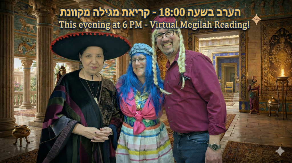 שימו לב: לאחר קריאת המגילה יוזמנו החברים/ות להיכנס לזום. כך נוכל לראות זה את זה ונרים ביחד כוסית לחיים עם אוזן המן ליד. 🙂 הקישור לזום יישלח אליכם/ן בנפרד הערב, לאחר קריאת המגילה.
